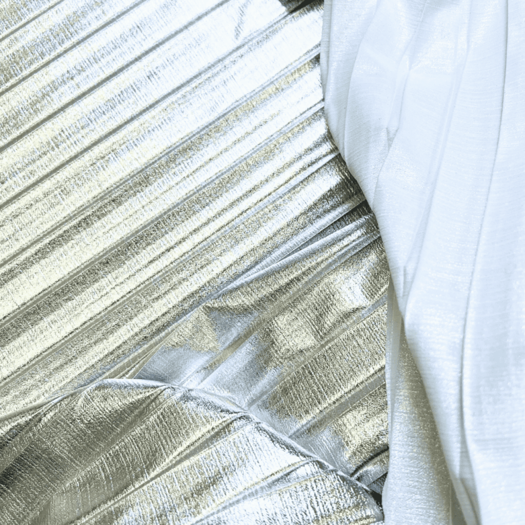 Šifon Plisé lamé je plisirana tkanina z bleščečim nanosom, primerna za izdelavo svečanih in modnih oblačil.