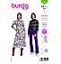 Set od dva zanimljiva kroja za haljinu i bluzu s asimetričnim naborima koji se spuštaju od šava ramena. Oba modela imaju visoki ovratnik. Haljina je krojena u struku i ima prekrasno padajuću široku suknju i ravne rukave. Bluza osvaja širokim manžetama i remenom.