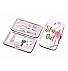 Pribor za šivanje u praktičnoj torbici od umjetne kože s printom. Torbica se lako otvara pritiskom na gumb.