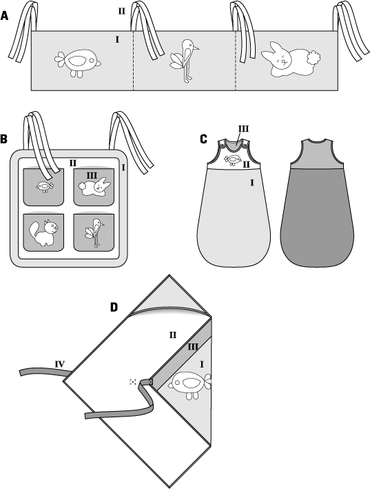 Oaza udobnosti za najmlađe: mekano, udobno i ukrašeno slatkim aplikacijama. Gnijezdo A se jednostavno veže za dječji krevetić, dodatak B ima četiri džepića za spremanje svih potrebnih sitnica. Vreća za spavanje C kopča se na ramenima za jednostavno oblačenje.