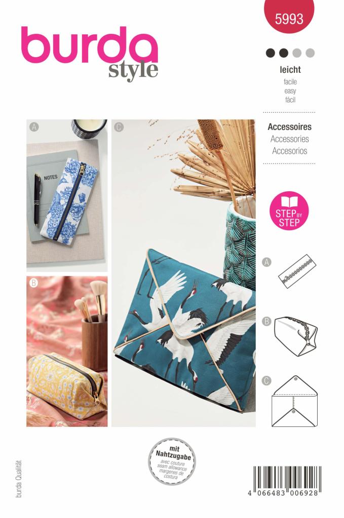 Komplet dodataka za školski pribor uključuje dvije pernice na patent zatvarač, prikladne za pohranu pisaćeg pribora ili kozmetike, te torbicu u obliku omotnice.