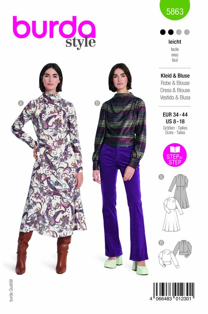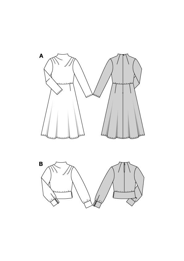Set od dva zanimljiva kroja za haljinu i bluzu s asimetričnim naborima koji se spuštaju od šava ramena. Oba modela imaju visoki ovratnik. Haljina je krojena u struku i ima prekrasno padajuću široku suknju i ravne rukave. Bluza osvaja širokim manžetama i remenom.