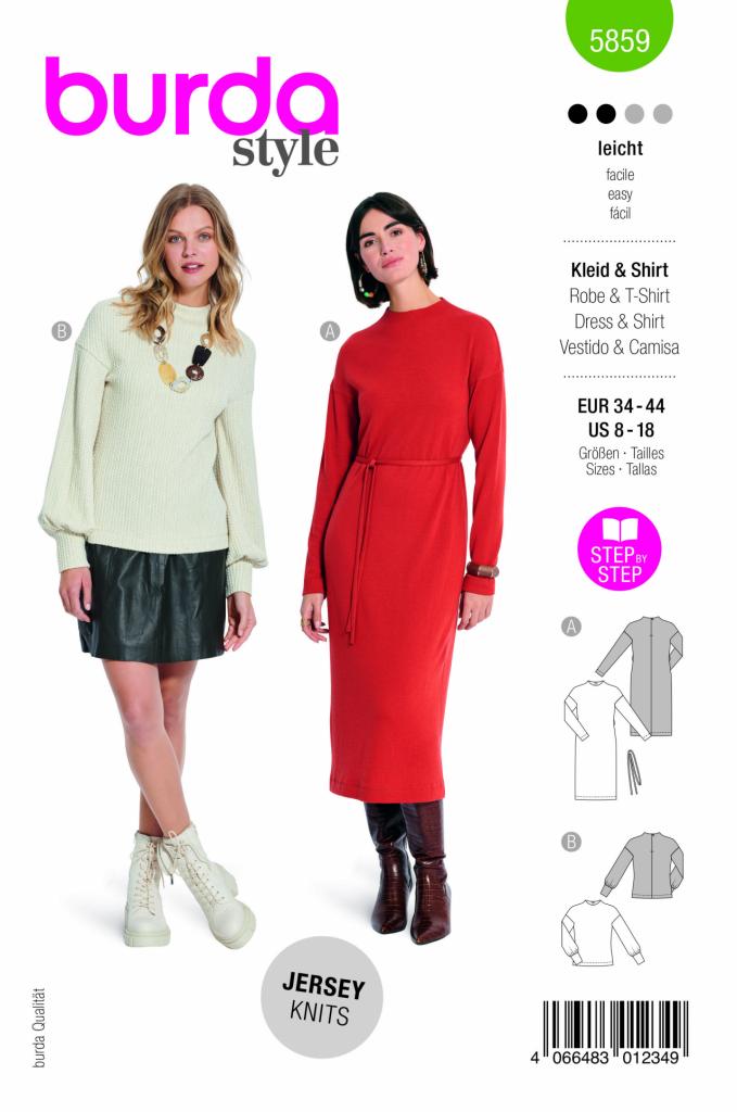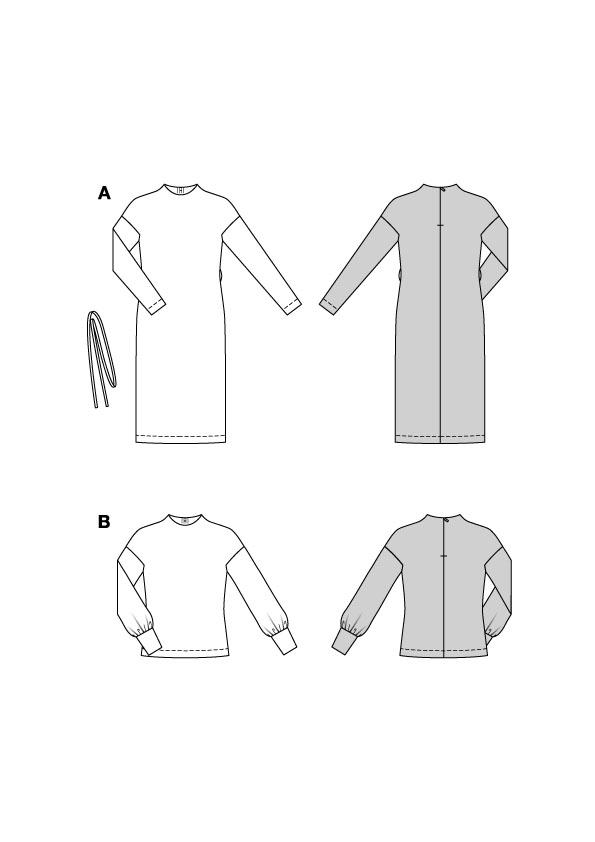 U kompletu se nalazi kroj za jednostavnu, udobnu, ali elegantnu haljinu ravnih linija s povišenim ovratnikom, dugim rukavima i uskim pojasom. Drugi kroj je pulover sa širokim rukavima i patentnim zatvaračem na leđima.