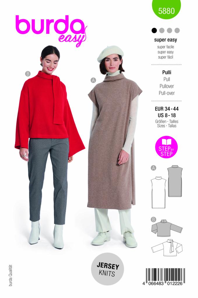 Komplet krojeva za haljinu i pulover od pletenih materijala. Haljina je bez rukava i ima široki puli ovratnik, dok pulover ima široke rukave i šal ovratnik.