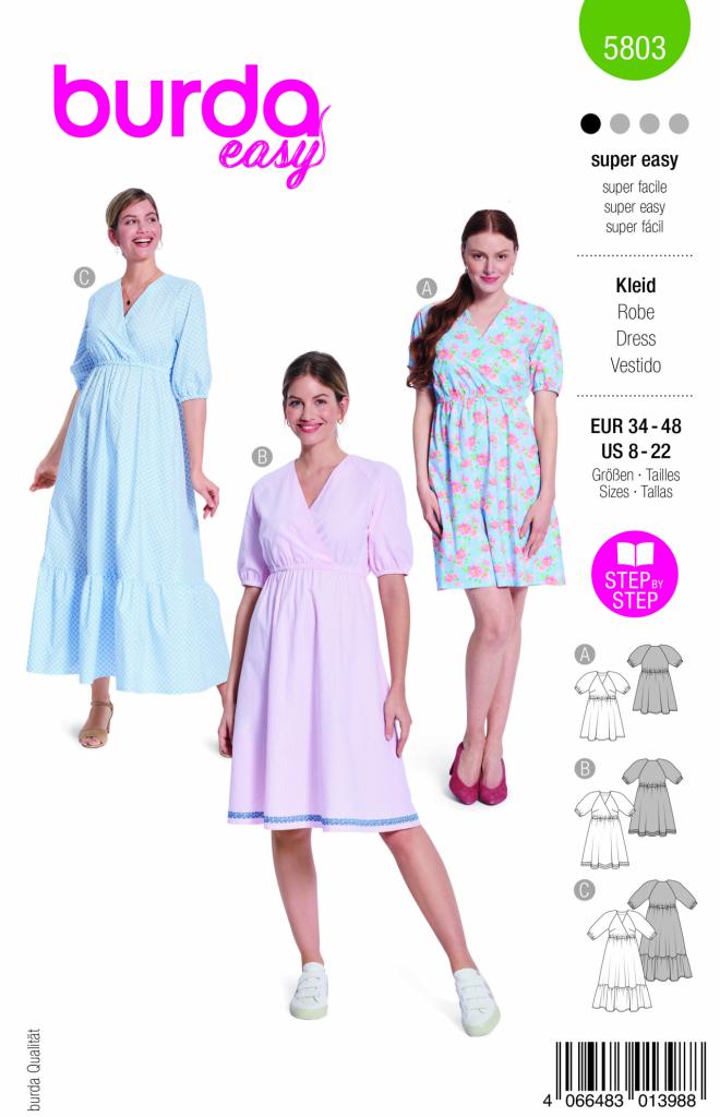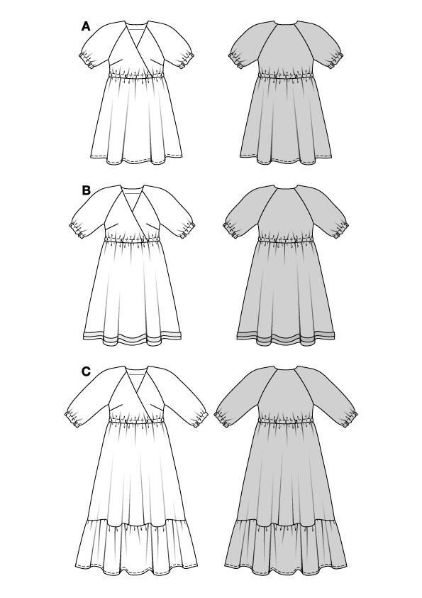 Set tri svestrana kroja za početnike za ljetnu haljinu s gornjim dijelom na preklop i suknjom mini, midi i maxi duljine.