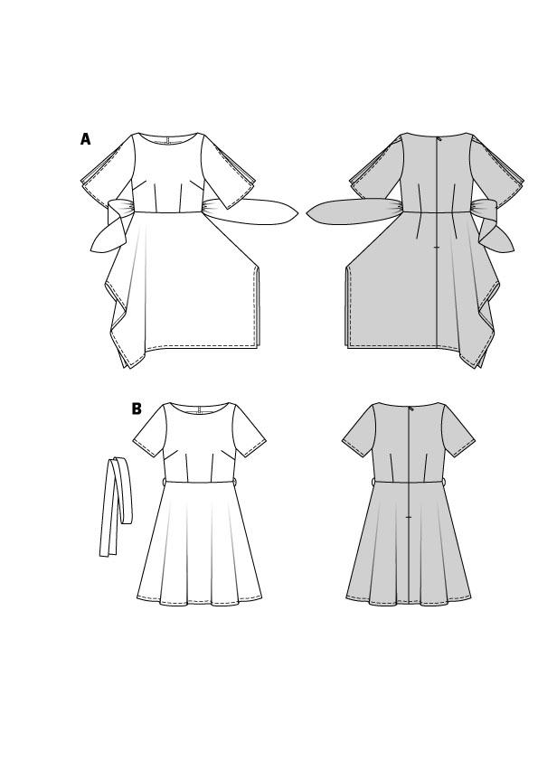 Kroj za dvije verzije haljine kratkih rukava, jednostavna za šivanje i nošenje. Model A ima nejednaku duljinu, proširene rukave i proreze, a u struku se veže širokim vrpcama ušivenim u bočni šav. Haljina B ima proširenu suknju, klasične kratke rukave i dodatni remen za vezanje.