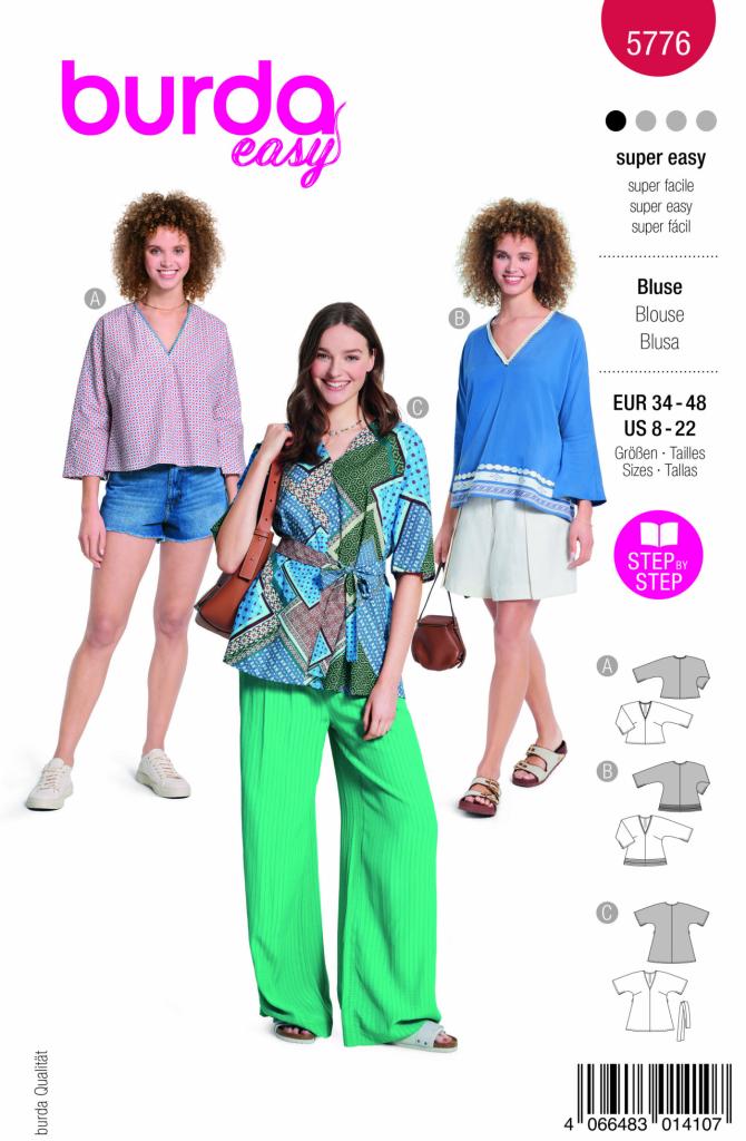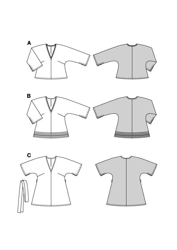 Komplet triju jednostavnih krojeva za bluzu, kratku i dugu tuniku s dekorativnim rubovima. Najlakša razina težine.