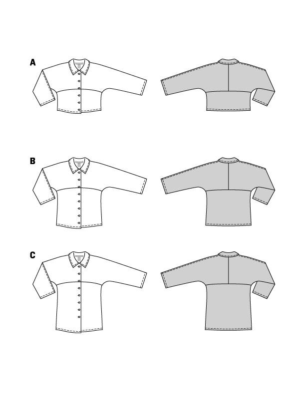 Jednostavna košulja u tri različite duljine, sa skraćenim rukavima bez manžeta, klasičnim košulja-ovratnikom i kopčanjem na gumbe.