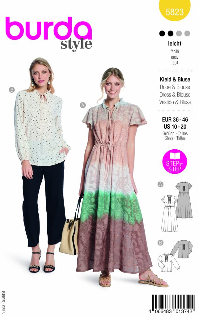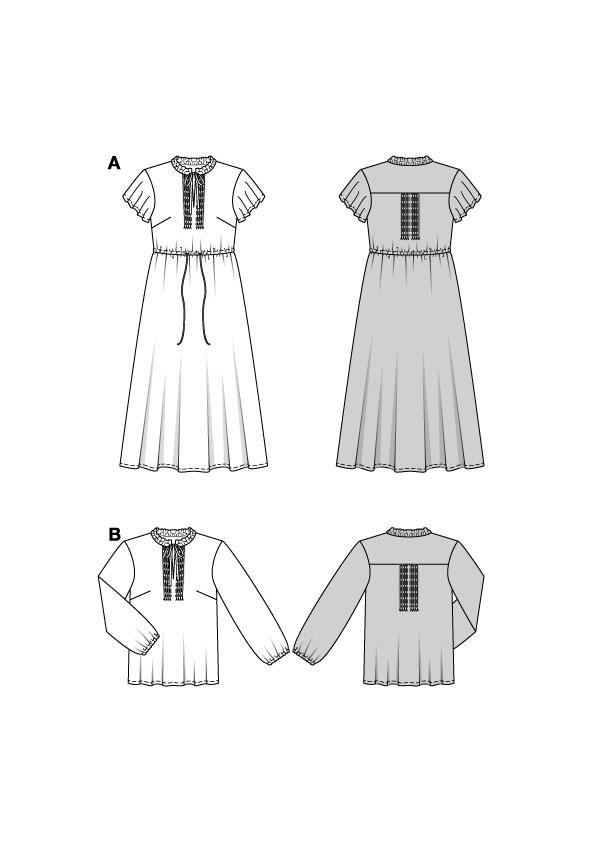 Komplet krojeva za maxi haljinu i bluzu koje s naborima oko vratnog izreza odišu ženstvenom elegancijom.