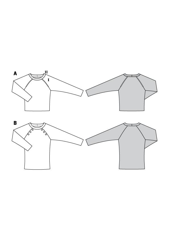 Pulover sa 7/8 rukavima i okruglim izrezom savršen je za slobodno vrijeme, a uz to je i jednostavan za šivanje. Možete birati između kraće varijante s paspuliranim rubovima na raglan šavovima ili duže verzije koju krase dva dijagonalna reda dugmadi uz rukavne šavove.
