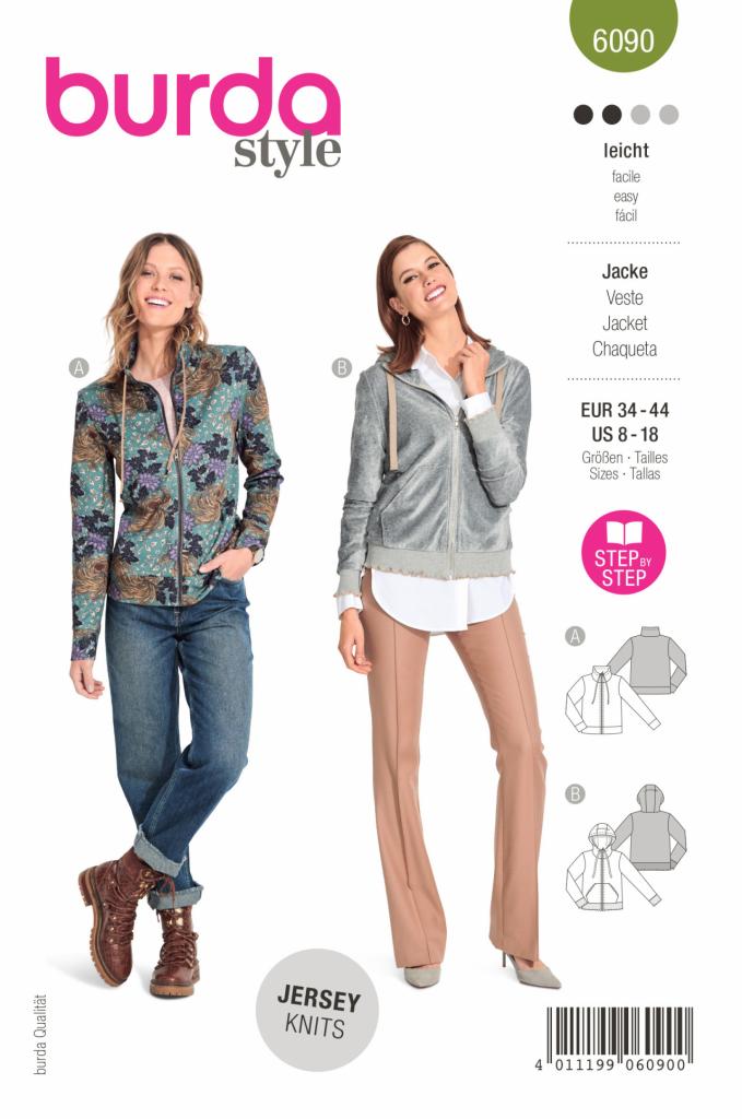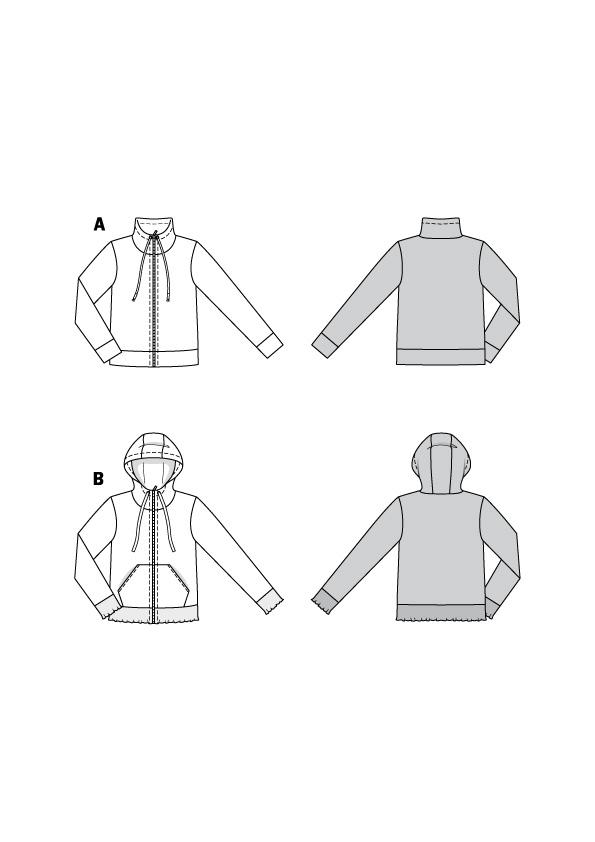Dvije verzije sportske i elegantne jakne s patentnim zatvaračem. Možete birati između modela A s ovratnikom ili modela B s kapuljačom i džepovima.