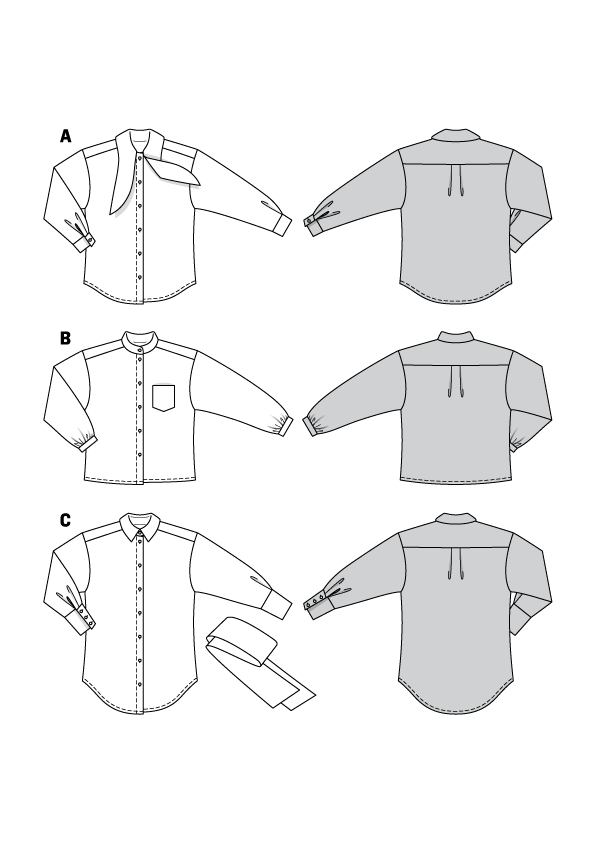 Tri varijante klasične košulje obogaćene s ne tako klasičnim detaljima. Model A očarava ovratnikom koji se veže u čvor, model B ima uski ruski ovratnik, dok duža varijanta C ima zaobljene rubove i veže se u struku trakom.