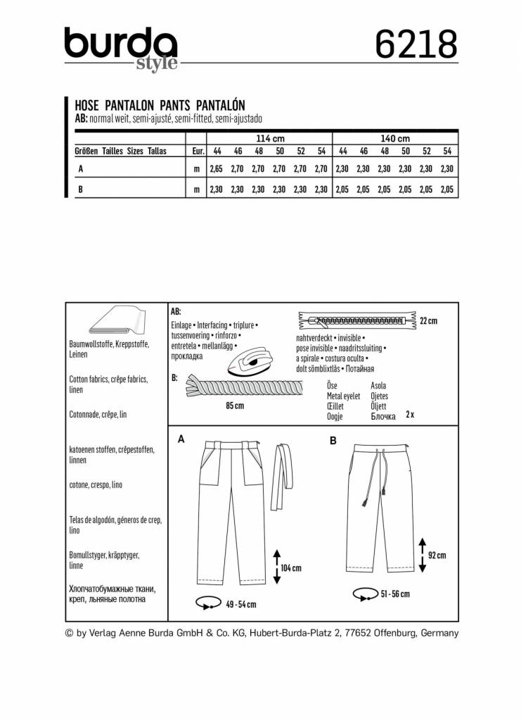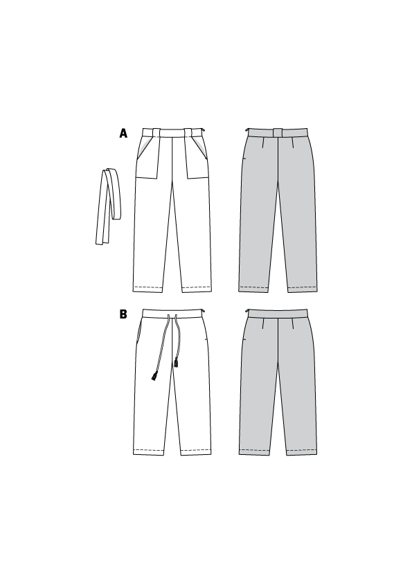 Kroj za lagane i prozračne hlače, prikladne za proljeće ili ljeto. Širinu struka možete prilagoditi vezicom ili remenom za vezanje. Možete birati između velikih našivenih džepova ili džepova ušivenih u bočni šav.