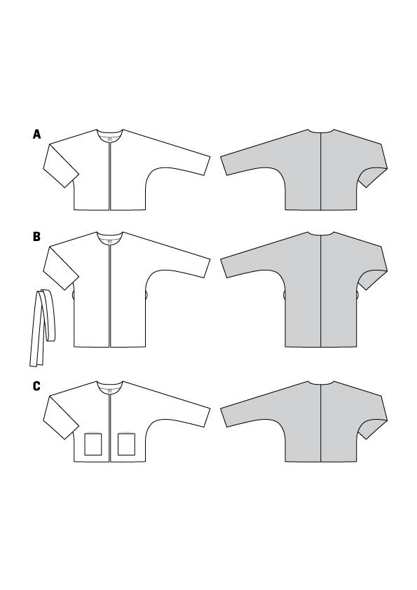 Jednostavan, nepodstavljeni, prijelazni kroj jakne bez ovratnika. Dostupna u dvije duljine, s džepovima ili remenom po želji.