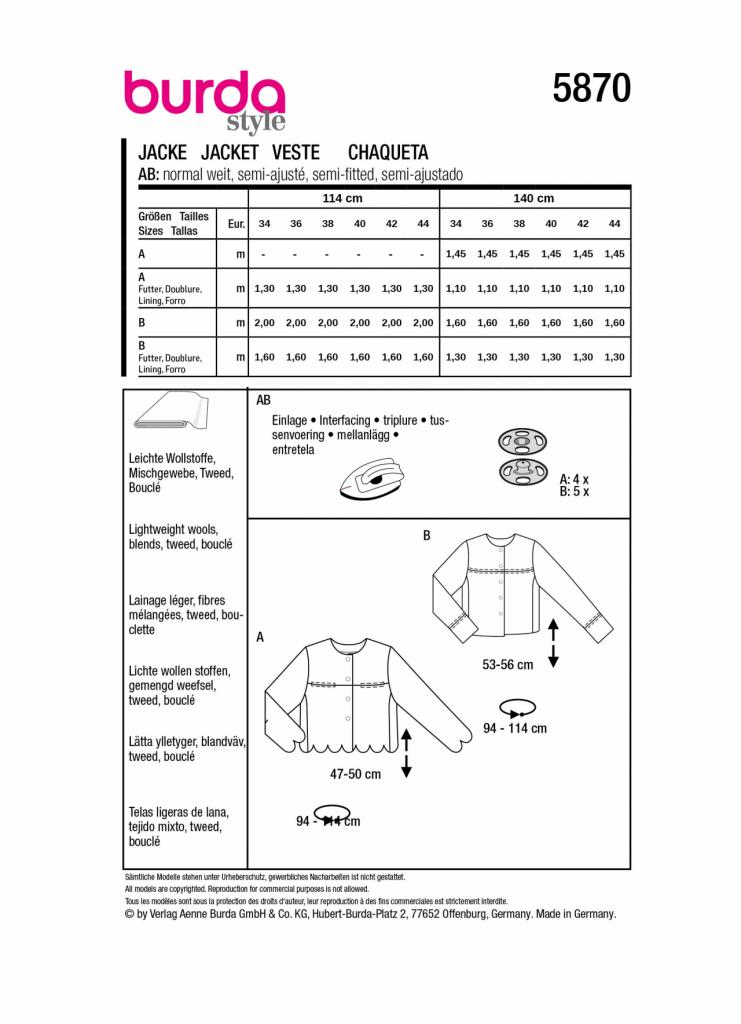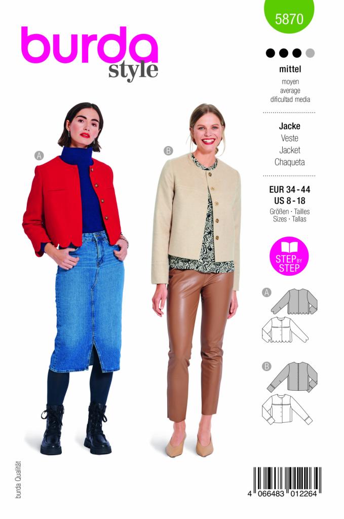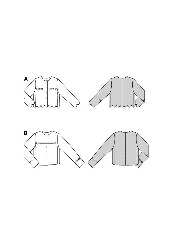 Dvije verzije kratke jakne ravnog kroja i okruglog izreza. Kraća jakna A ima džepove ušivene u bočni šav i valoviti završetak na duljini i rukavima. Jakna B je nešto duža, ima široke manžete i ukrasne šavove. Savjet: Kombinirajte jaknu A s odgovarajućom suknjom (kroj 5868) za šik odjevni predmet.