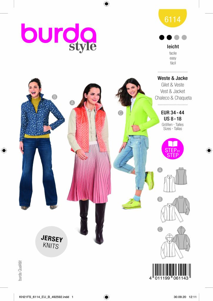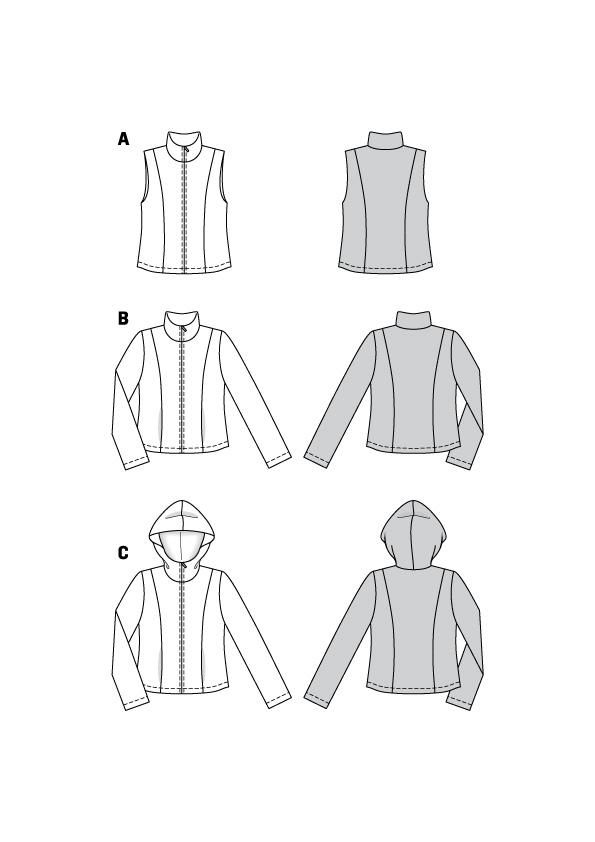 Kroj za tri modela, dvije jakne i jedan prsluk. Možete birati između verzije s ovratnikom ili kapuljačom.