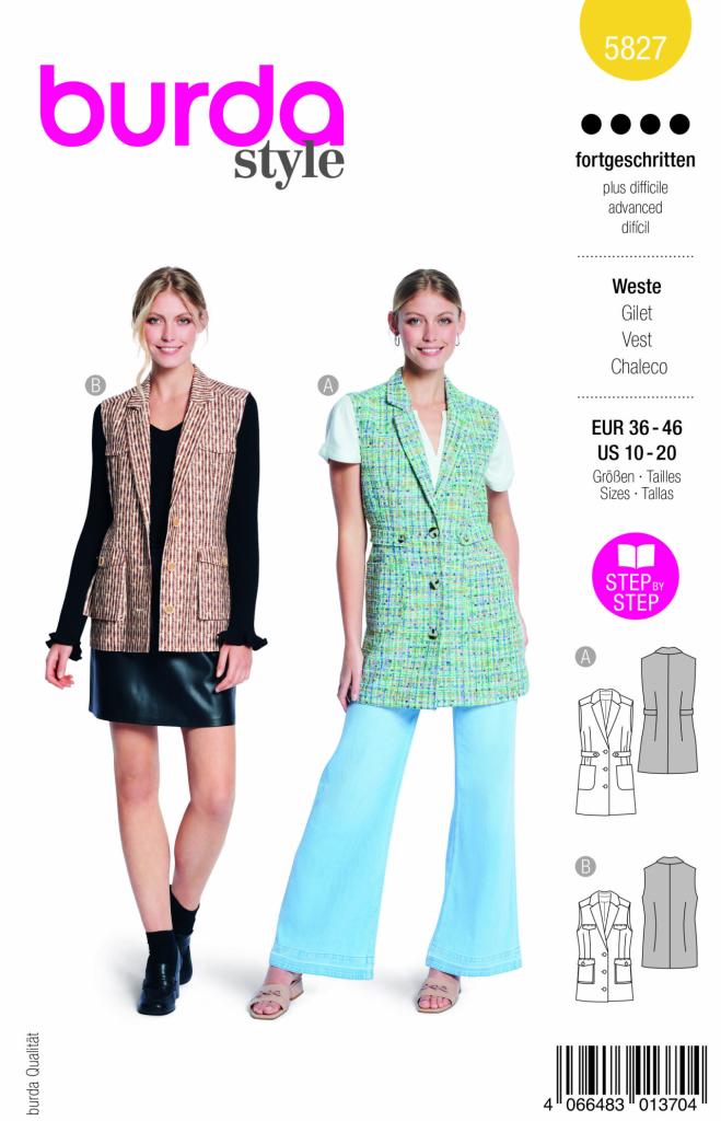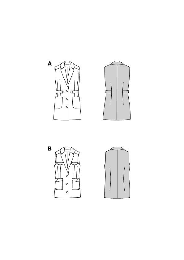 Kroj za dvije varijante dužeg ženskog prsluka s reverima i džepovima s poklopcima. Najzahtjevnija razina težine.