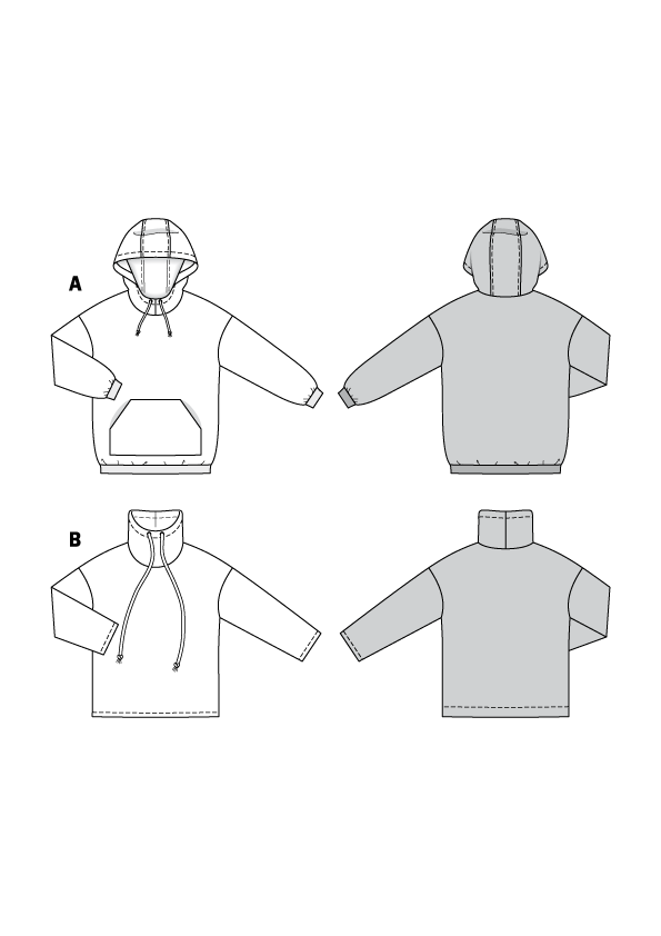 Kroj za sportski pulover s puli ovratnikom ili kapuljačom, sa prednjim džepom ili bez.