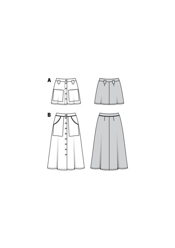 Kroj za modernu suknju s prednjim kopčanjem na gumbe i velikim našivenim džepovima, u mini ili midi ...