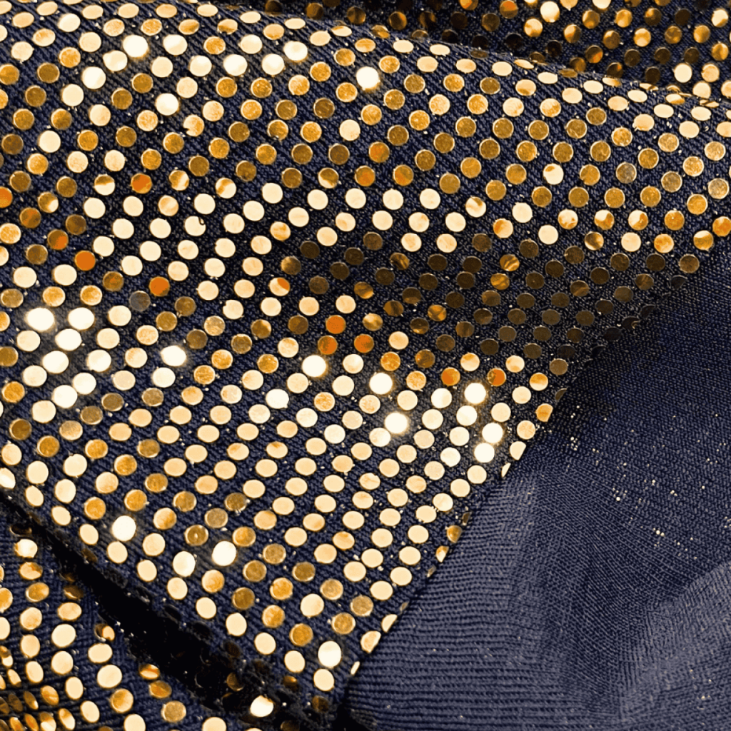 - >Materijali za šivanje>Tkanina s nanosom i efektima>Pletivo Šjajne točkice | zlatna | 87%PA / 8%PL / 5%EL