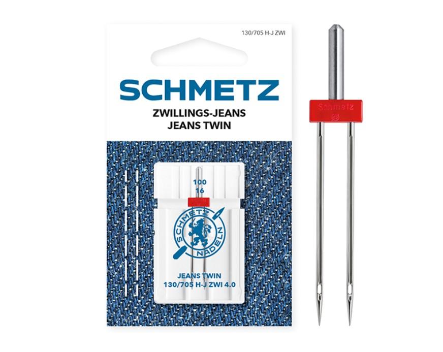 Dvostruka igla Schmetz Jeans / Denim ima razmak od 4 mm i debljinu od 100. Pogodna je za šivanje debljih tkanina.