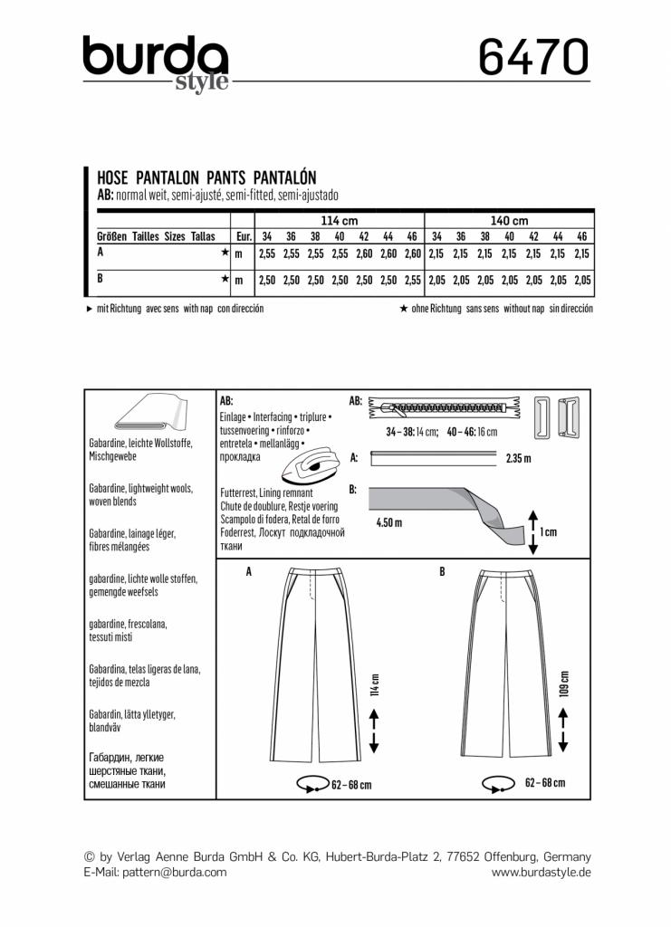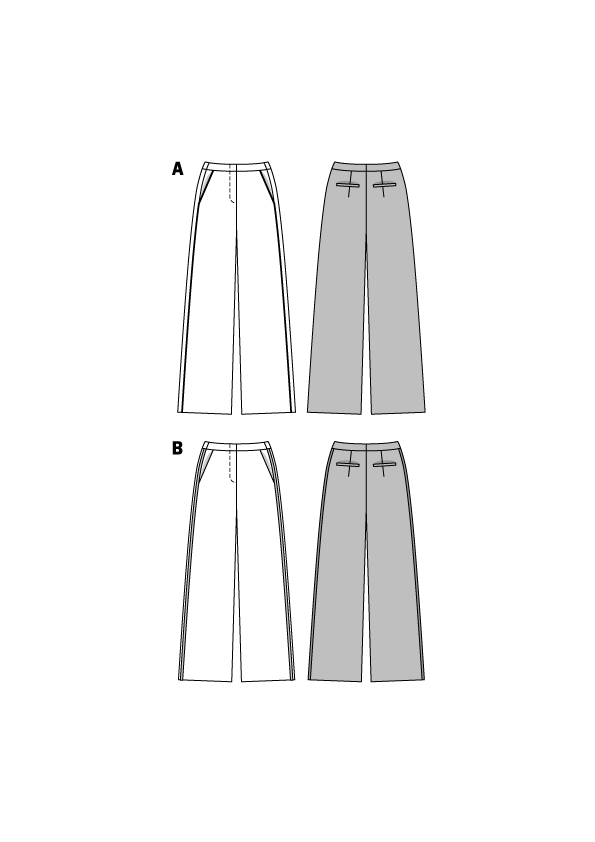 Kroj za dve različici elegantnih širokih hlač s poudarjenimi, rahlo naprej pomaknjenimi šivi. Šive lahko poudarite z okrasnimi trakovi ali paspulo.