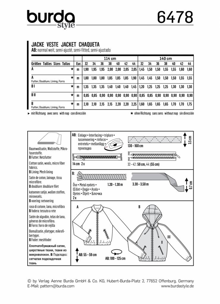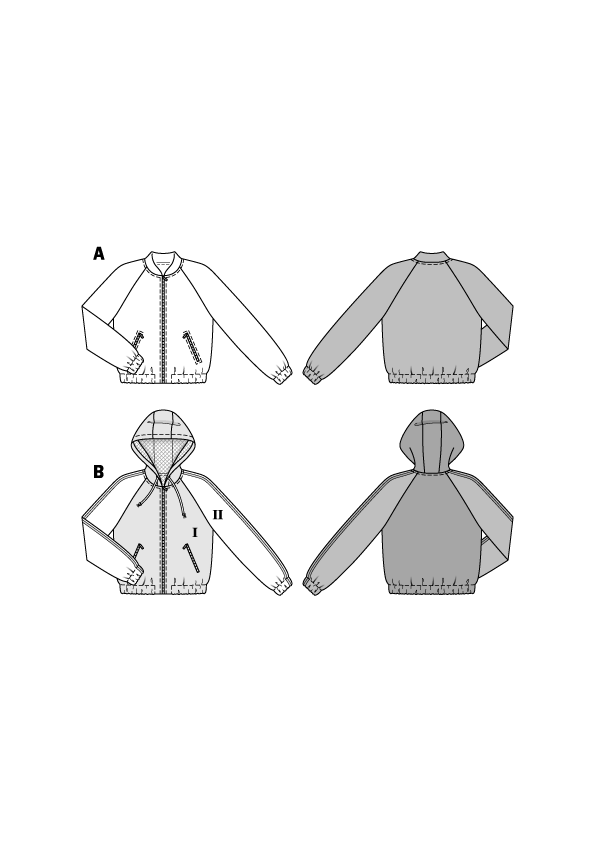 Kroj za dve kratki športni jakni z raglan rokavi, zapenjanjem na zadrgo in elastiko v pasu ter na rokavih. Model A s stoječim ovratnikom v bomber stilu, model B s kapuco v športnem stilu.