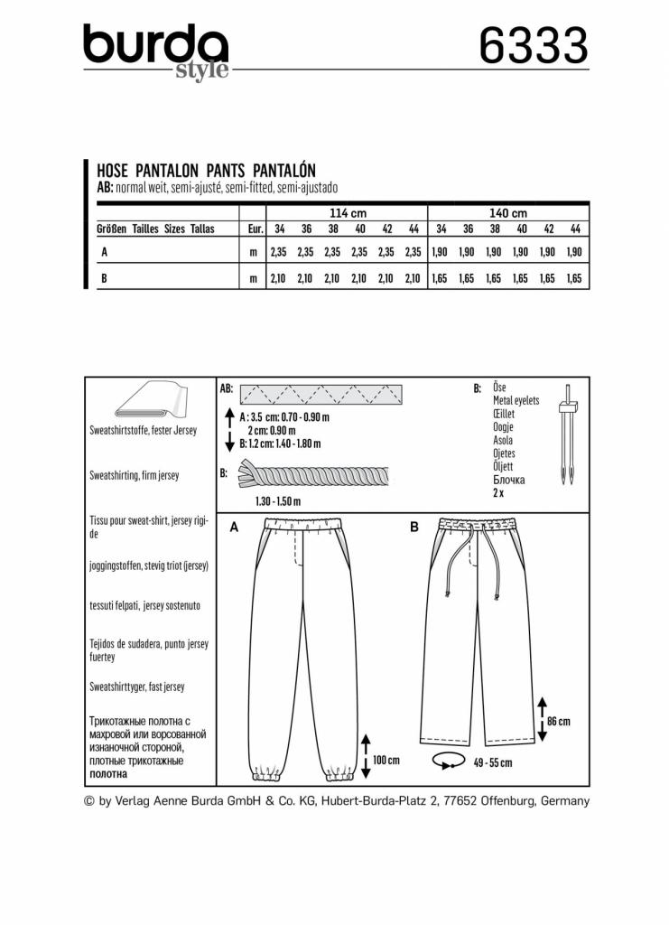 Kroj za dve različici udobnih hlač za prosti čas. Varianta A v stilu trenirke ima elastiko v pasu in v gležnjih. Varianta B ima široke, rahlo skrajšane hlačnice, v pasu pa elastiko in vrvico za zategovanje.