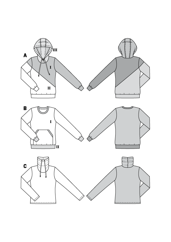kroj za športni pulover v treh variantah: s kapuco, z visokim šal ovratnikom ali okroglim izrezom s patentno obrobo.