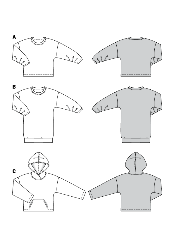 Kroj za tri različice udobnega puloverja za prosti čas. Izbirate lahko med različnimi dolžinami, med kapuco ali patentnim ovratnikom. Modela A in B imata na rokavih zanimiv detajl gub.
