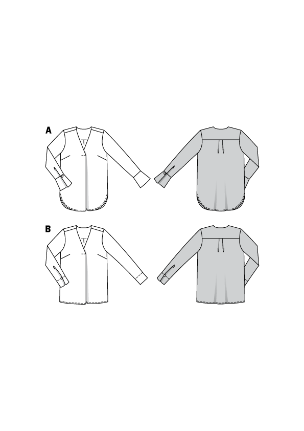 Kroj za brezčasno bluzo z zanimivimi detajli, kot so: guba, ki je speljana iz vratnega izreza in se širi proti dolžini modela, ramensko sedelce in videz preklopa na sprednjem delu.