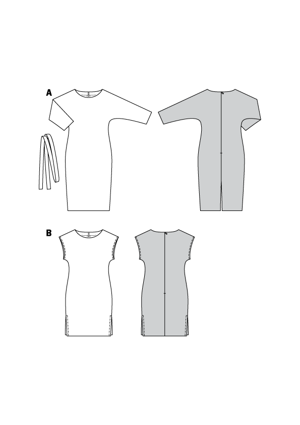 Minimalistična obleka ravnih linij v dveh variantah, s tričetrt ali kratkimi rokavi, s pasom ali brez. Obe varianti imata na hrbtu skrito zadrgo za lažje oblačenje, varianta B pa ima še stranske razporke.