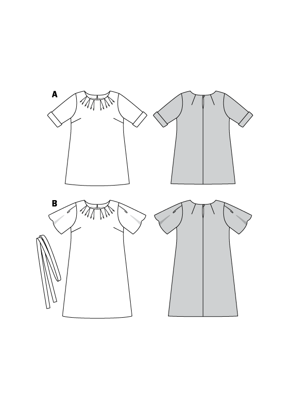 Kroj za žensko tuniko ali obleko s kratkimi rokavi in očarljivimi drobnimi gubicami na vratnem izrezu. Izbirate lahko med dolžino do kolen ali dolžino tunike ter med nabranimi, lepo padajočimi ali ravnimi rokavi z obrobo.