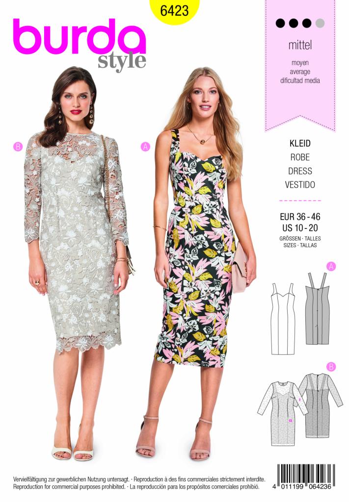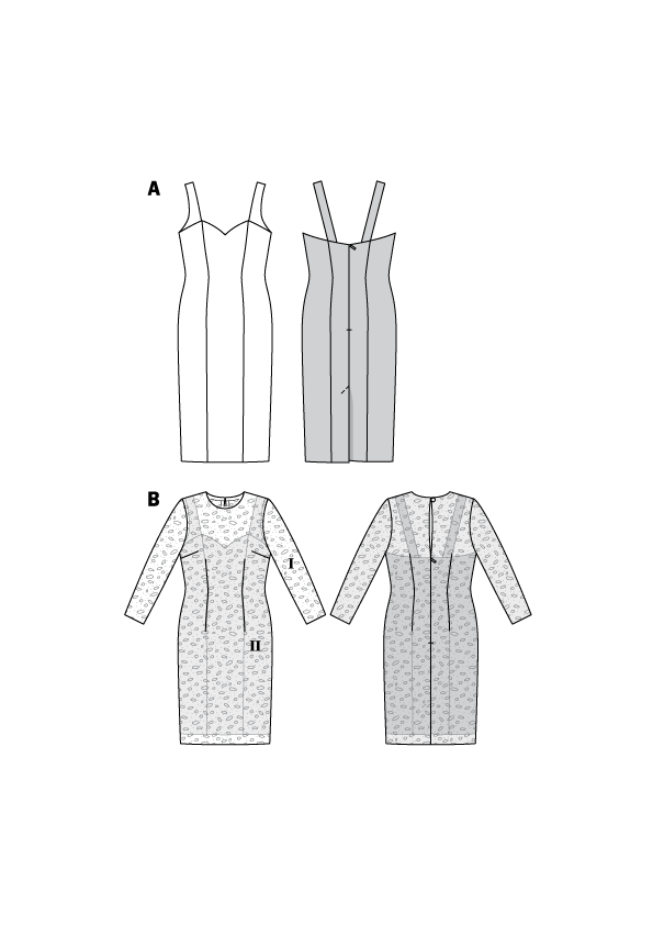Obleka z naramnicami in srčastim vratnim izrezom je lahko izjemno ženstvena in modna samostojna obleka (varianta A), kroj pa lahko služi tudi kot spodnji del elegantne čipkaste obleke z rokavi (varianta B). V vsakem primeru pa neizogibno očara s svojo zapeljivostjo.
