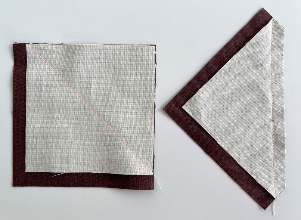 En kvadrat položimo na osnovni kvadrat peclja. Zašijemo po narisani liniji, višek blaga odrežemo z dodatkom za šiv 0,75 cm od šiva. Ponovimo na drugi strani. Zalikamo.