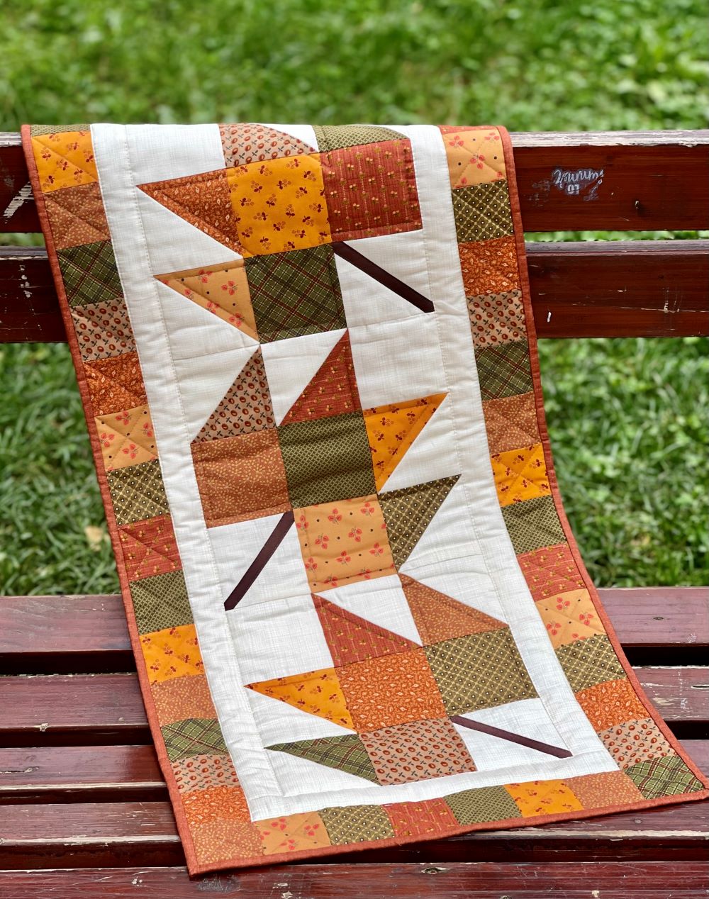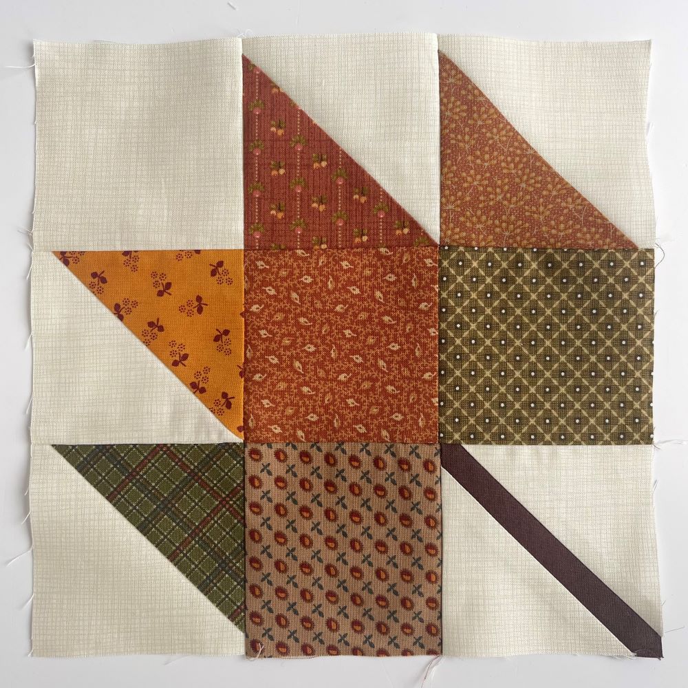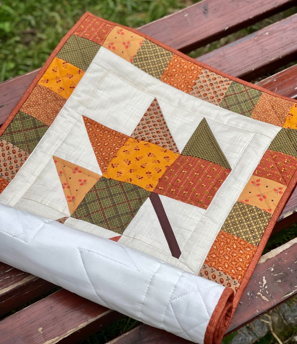 Za izdelavo jesenskega lista končne velikosti 24 cm x 24 cm potrebujemo patchwork blago različnih vzorcev in kredni svinčnik.