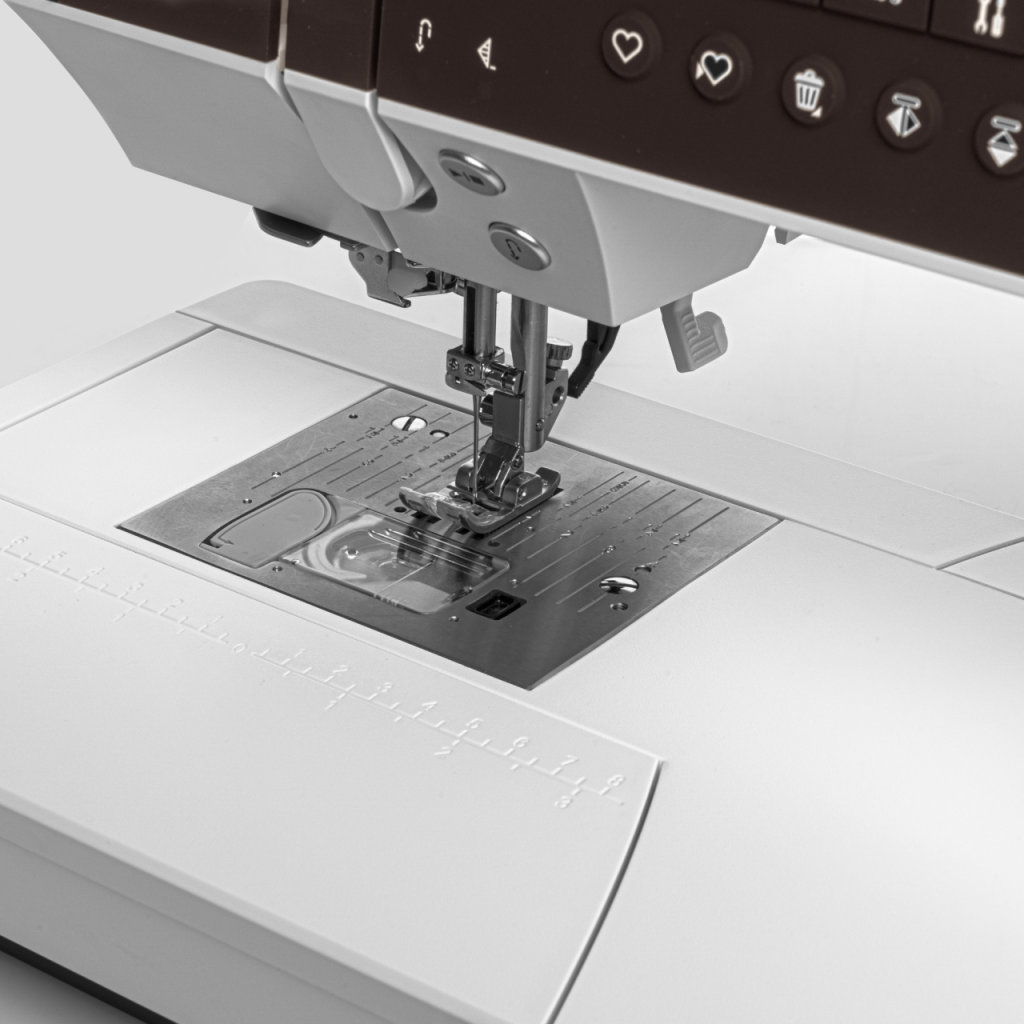 - tipke za elektronsko vodenje stroja: start/stop tipka za šivanje brez stopalke, tipka za vzvratno šivanje, tipka za avtomatsko zatrjevanje, tipka za avtomatski odrez sukanca z možnostjo programiranja, tipka za iglo gor/dol za ustavitev igle vedno v istem položaju, drsnik za hitrost šivanja določi maksimalno hitrost šivanja ne glede na to, koliko pritisnemo na stopalko