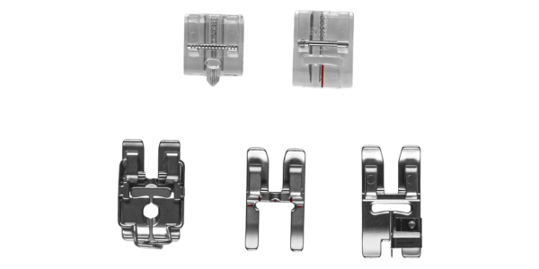 Ekskluzivni komplet pribora vsebuje pet dodatnih tačk: ožjo tačko z vodilom za sistem IDT, tačko za skrito zadrgo, tačko za obrobljanje, tačko za všivanje vrvic za sistem IDT in odprto tačko za aplikacije za sistem IDT.